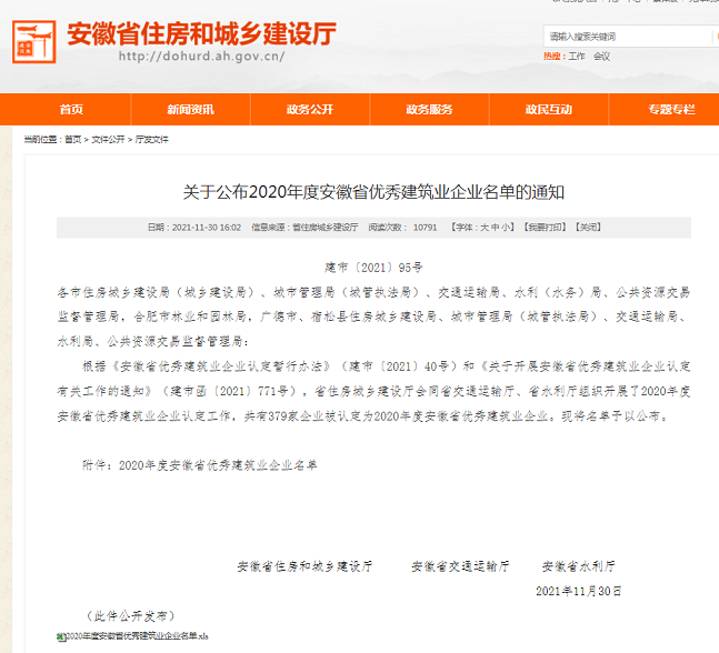 据悉,本次评优是由安徽省住房和城乡建设厅、省交通运输厅、省水利厅首次联合开展的全省优秀建筑业企业认定评选活动,安徽省优秀建筑业企业称号是对我省建筑业企业综合实力的认定。
