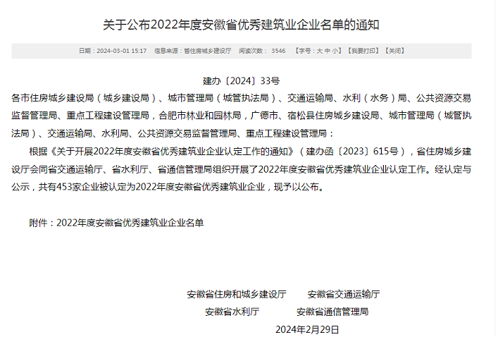 近日,安徽省住房和城乡建设厅发布了“2022年度安徽省优秀建筑业企业”名单,开云网页版·官方版在线登入-开云(中国) 凭借企业经营发展、管理创新能力、企业建造能力、开云网页版·官方版在线登入建设、社会责任履行等方面的卓越表现再次名列榜单――建筑工程总承包类(特级、一级类别)省优秀建筑业企业,连续多年斩获该项殊荣。