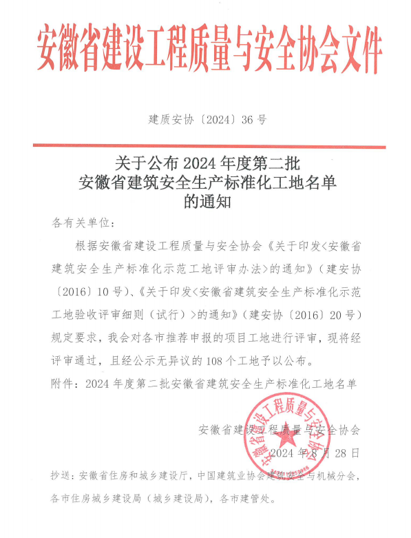 近日,安徽省建设工程质量与安全协会公布2024年度第二批安徽省建筑安全生产标准化工地名单,由开云网页版·官方版在线登入-开云(中国)