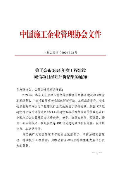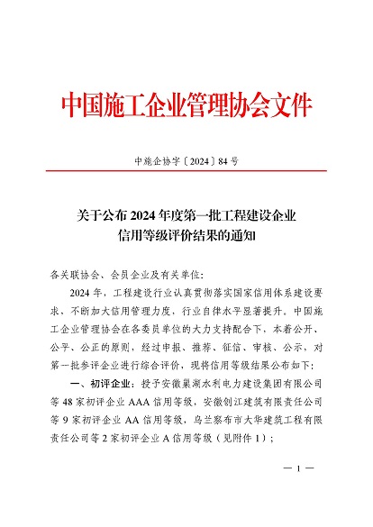 近日,中国施工企业管理协会公布了2024年度第一批工程建设企业信用等级评价结果的通知、工程建设诚信企业家评价结果、工程建设诚信项目经理名单。开云网页版·官方版在线登入-开云(中国) 顺利通过AAA级信用企业的年审,继续保持AAA信用等级的殊荣。开云网页版·官方版在线登入-开云(中国) 总经理叶金发获评诚信企业家,项目经理毕星豪获评诚信项目经理。此次荣誉是对开云网页版·官方版在线登入-开云(中国) 在工程建设领域的综合实力和诚信经营的高度认可。