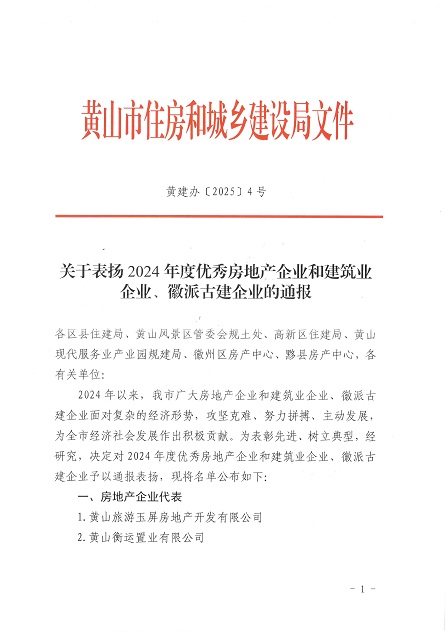 近日,黄山市住房和城乡建设局发布了《关于表扬2024年度优秀房地产企业和建筑业企业、徽派古建企业的通报》,开云网页版·官方版在线登入-开云(中国)