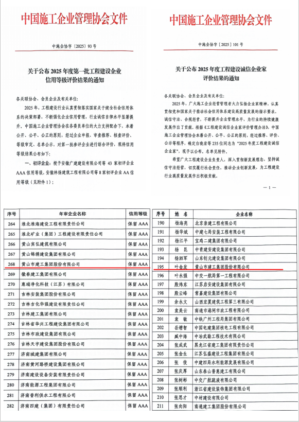 荣誉承载责任,诚信铸就未来。此次系列荣誉的取得,是社会各界及行业权威机构对黄山市建工集团长期坚持“质量第一、信誉至上”经营宗旨的集中肯定。连续保持AAA级信用评级,以及企业家、项目经理多人入选诚信先进名单,不仅提升了公司的品牌价值与市场竞争力,也为公司在更广阔的市场中赢得了信赖与机遇。