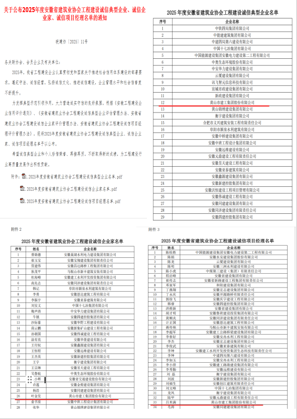 荣誉承载责任,诚信铸就未来。此次系列荣誉的取得,是社会各界及行业权威机构对黄山市建工集团长期坚持“质量第一、信誉至上”经营宗旨的集中肯定。连续保持AAA级信用评级,以及企业家、项目经理多人入选诚信先进名单,不仅提升了公司的品牌价值与市场竞争力,也为公司在更广阔的市场中赢得了信赖与机遇。